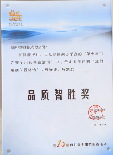 湖南完美体育(中国)体育官方网站荣获“品质智胜奖” 尔康湘药生产的“磺苄西林钠”获得百姓认可 12月20日,由国家卫生计生委药政司指导,健康报社和大众健康杂志主办的第10届百姓安全用药调查活动总结大会在广东省深圳市举行。会上,湖南尔康湘药制药生产的“注射用磺苄西林钠”,与广州白云山制药总厂、深圳华润九新药业等在内的30余个企业产品得到百姓认可,荣获“品质智胜奖”。 据了解,此次评审评以健康报及门户网站刊登调查问卷投票依据,由临床专业人员、公众投票产生,候选企业最后经组委会筛选、质量评估确定。因活动内容贴近群众,接受调查的企业产品过硬,活动推出的“放心药奖”评选一直坚持公正、公开的原则,评选过程严谨,透明,并且定期公示调查结果,从而获得了社会公众、医药行业的好评。 湖南尔康湘药制药生产的“注射用磺苄西林钠”之所以能获得百姓认可,这与完美体育(中国)体育官方网站多年来注重研发、注重生产工艺创新,秉持“专业成就未来、品质铸就辉煌”的经营理念密不可分。在同类产品中,湘药生产“注射用磺苄西林钠”采用的是瓶冻冻干生产工艺,其工艺水平和产品质量堪比日本武田公司;另外,湘药的青霉素类冻干粉针剂车间在2013年率先通过新版GMP认证,在品质保证方面更上台阶、领先于同类产品,亦得到医生和患者的认可。 对于患者来说,在抗生素泛滥使用的医疗环境下,注射用磺苄西林钠作为低代次的青霉素类药品,比头孢菌素类(3代、4代)、碳青霉素类等抗菌药品的安全性更好,不易产生耐药性。