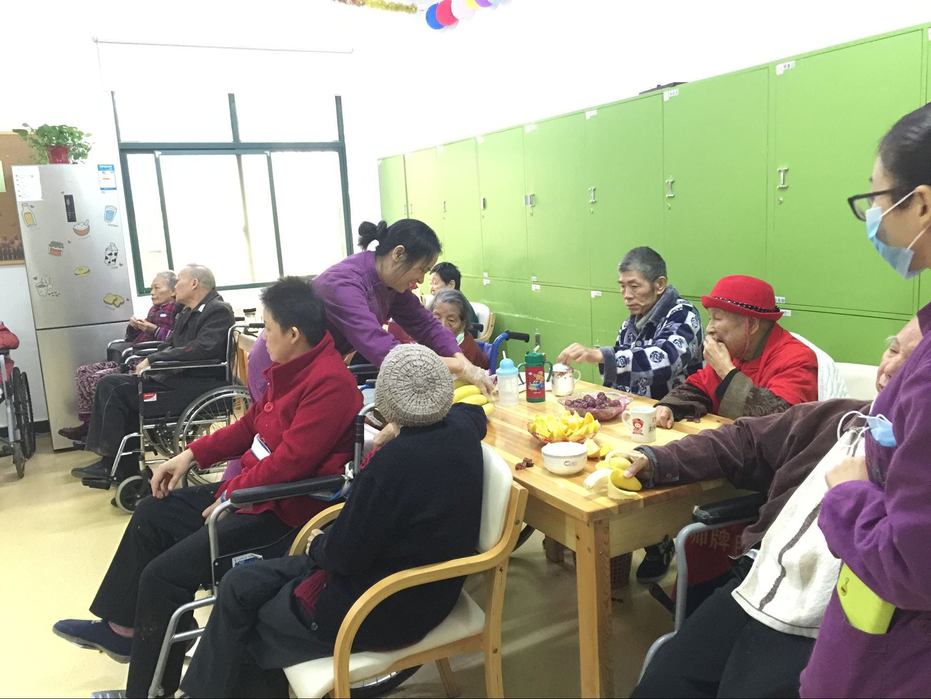 (图为工作人员帮小分队给老人们送上切好的水果)