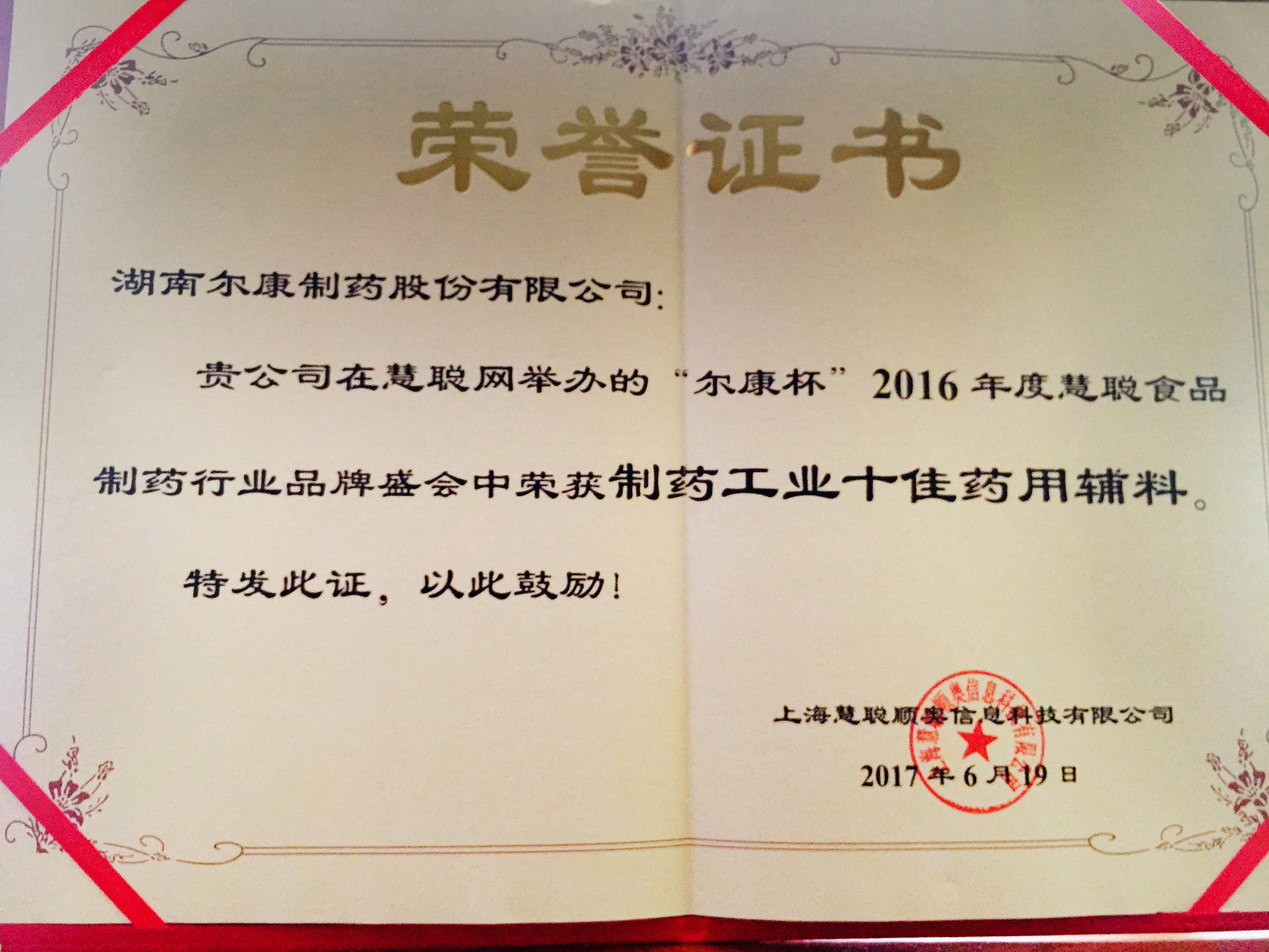 完美体育(中国)体育官方网站荣登“制药工业十佳药用辅料品牌”第一名